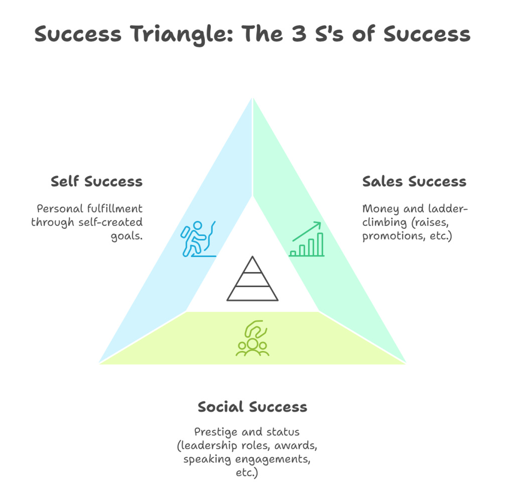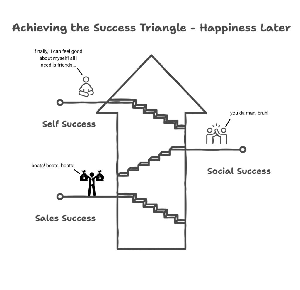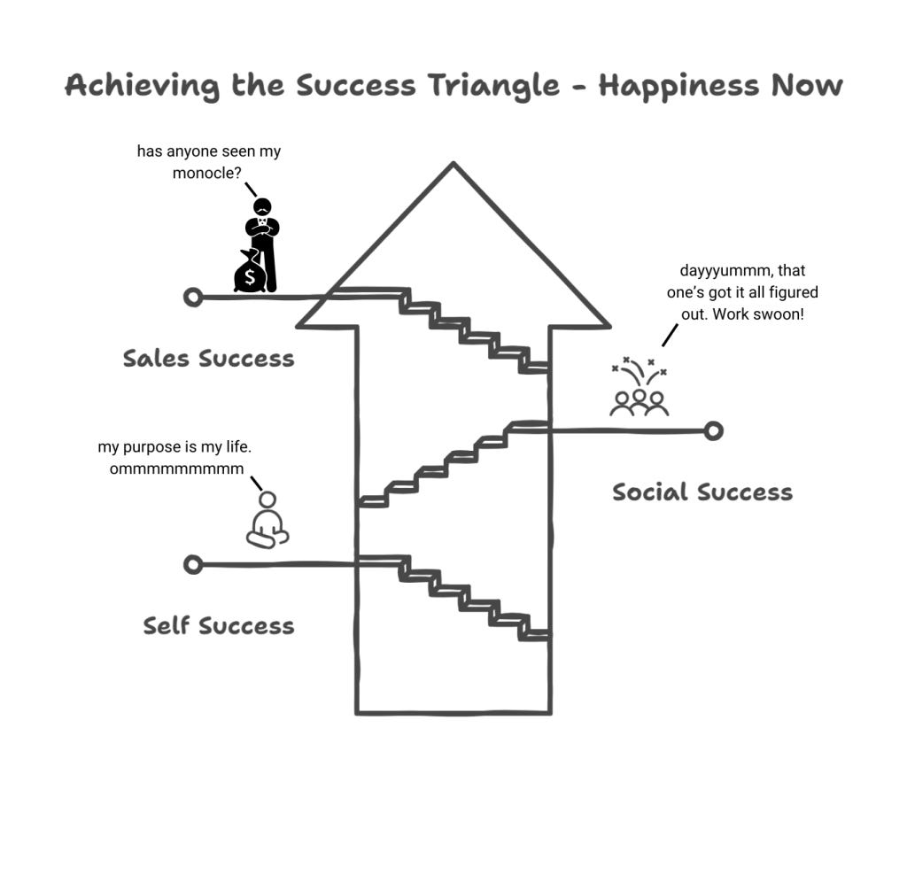 There are 2 problems with the success triangle. First, the order we chase them. We think we should pursue sales success first, then social, then self—each one sets up the other in a “work now, feel good later” mentality. It looks like this: